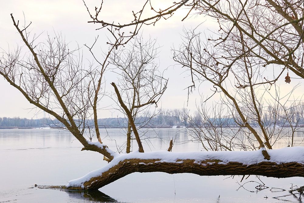 old willows on the shore of the icy lake Barleber See in the north of the city of Magdeburg on a cold winter day