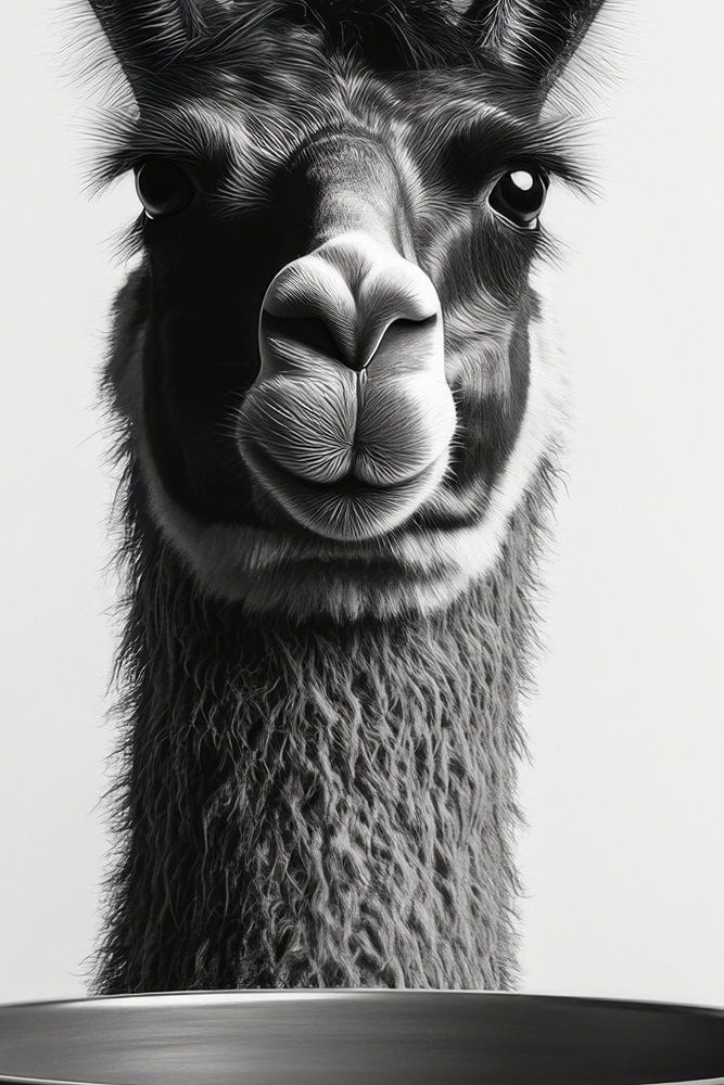 Ein charmantes, verspieltes Lama blickt neugierig über den Rand eines modernen, schwarzen Kochtopfs. Dessen minimalistische Form harmoniert mit dem fröhlichen Ausdruck des Tieres und sorgt für einen frischen Akzent. Ideal für die Küche, bringt dieses Bild stimmungsvolle Leichtigkeit und eine Prise Humor in den Raum.