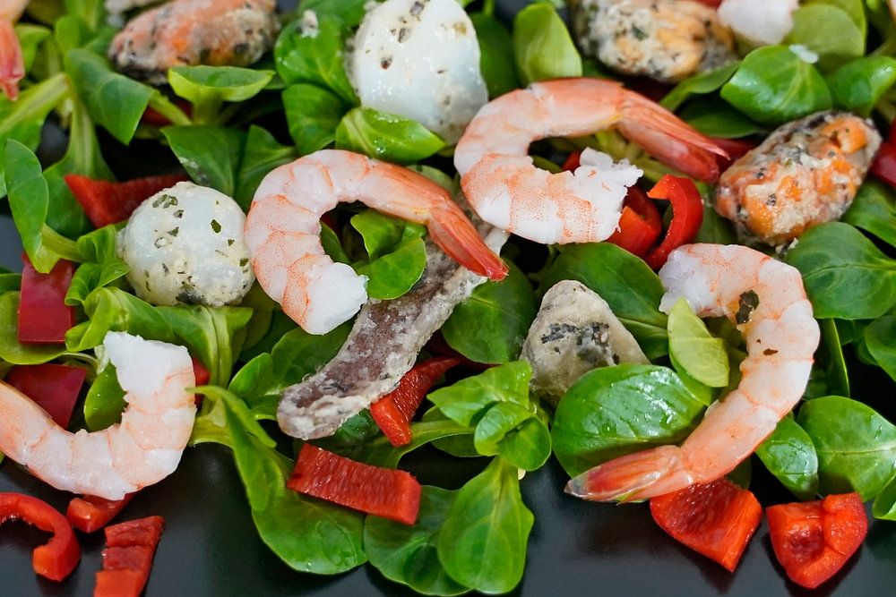 Lamb's lettuce with peppers and seafood served on a black serving platter