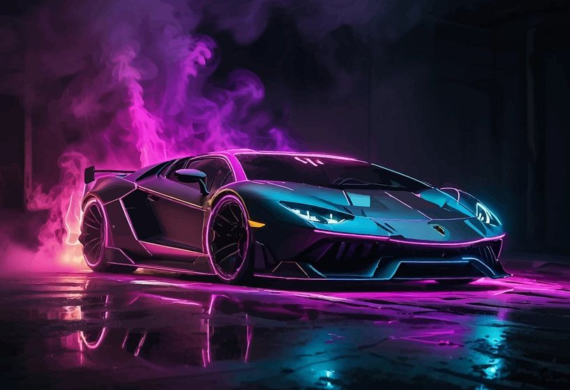 This artwork presents the Lamborghini Centenario in a dark cyberpunk showroom, where sharp neon accents, deep shadows, and drifting smoke amplify its extreme, futuristic design. Cinematic lighting sculpts the aggressive lines, exposed aero details, and low, powerful stance, making the car feel more like a machine from the future than a…
