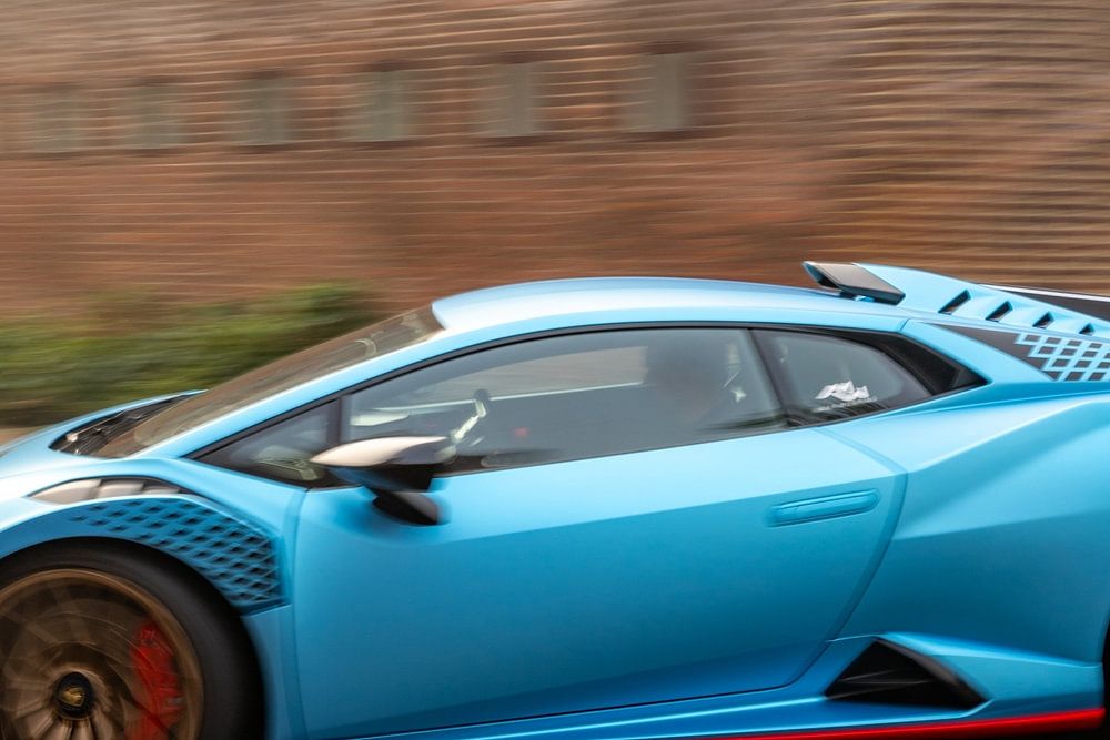 Lamborghini Huracán STO sports car driving on a street in Zwolle, Netherlands. The STO is a high performance edition of the Lambo Huracan with extreme aerodynamics, track-honed handling dynamics, lightweight contents and a high performing V10 engine. Photo with motion blur emphasizing the speed of the car.