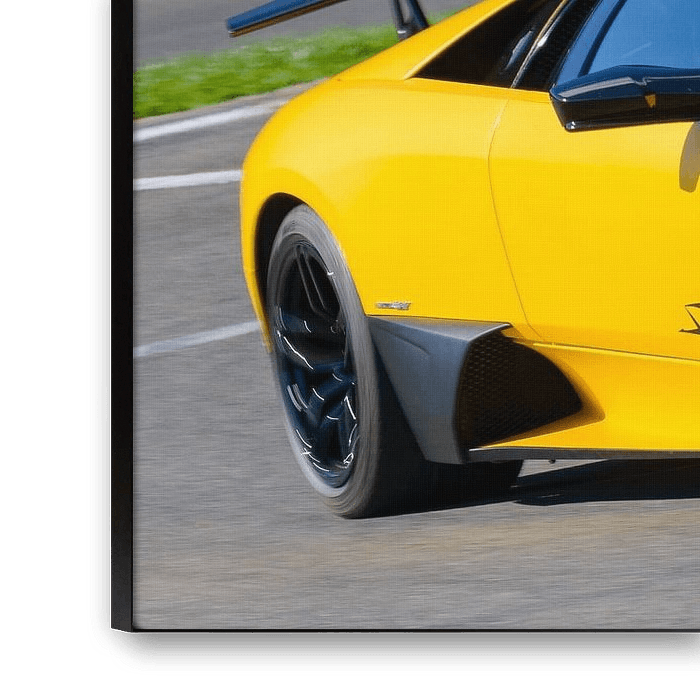 Yellow Lamborghini Murcielago Lp670-4 SV supercar driving at the Spa Francorchamps race track. The SV is a high speed and lightweight verison of the Lamborghini Murciélago sports car; SV stands for Super Veloce. The car is fitted with a V12 engine, producing 661 hp and has a top speed of more than 340 km/h.