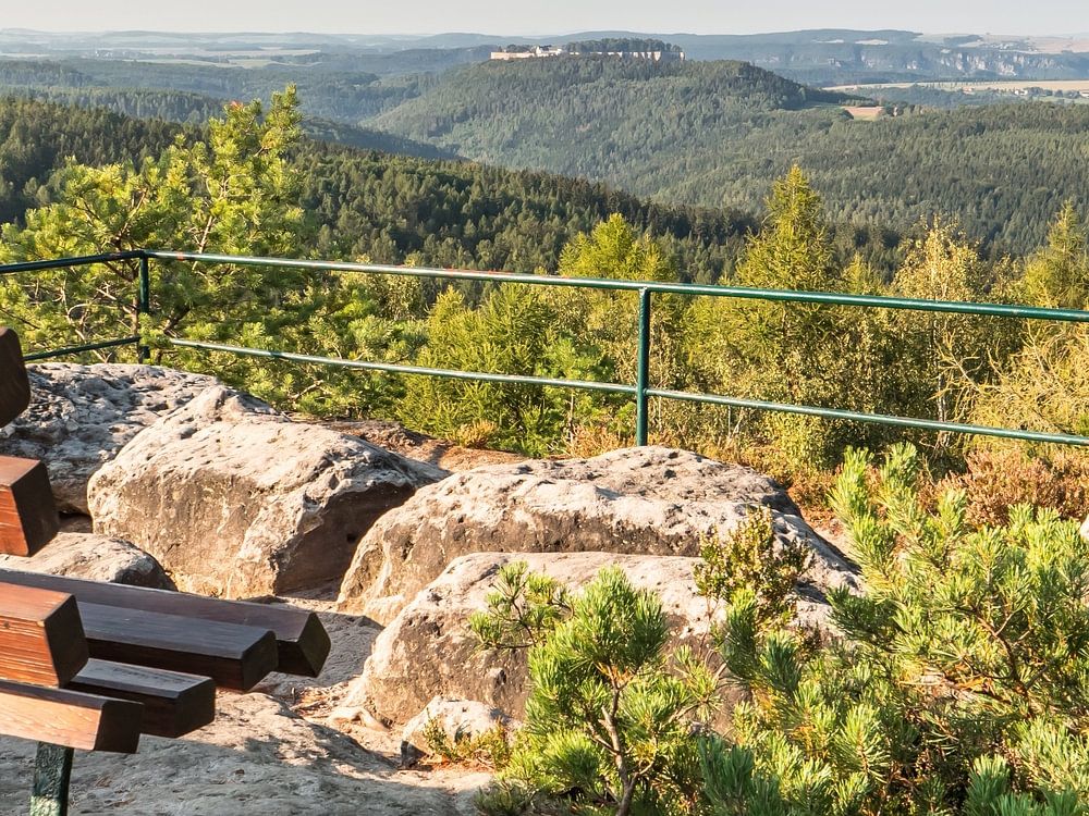 In the north of the Lampertstein the most beautiful view is waiting for its visitors. It is really a highlight how far you can overlook the surroundings. To make it a bit more comfortable, you can even look forward to a bench here, installed exactly so that you can also see the panorama of the Elbe Sandstone Mountains in front of you while sitting on it. Fortress Königstein, Lilienstein, Bastei, all the landmarks of the region can be seen from the Lampertstein.