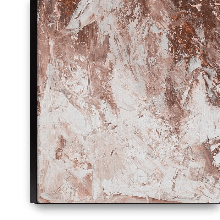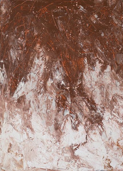 This work is a powerful experiment in colour, material and technique. The upper section consists of deep, warm earth tones with rough, expressive brushstrokes and visible scratches, whilst it transitions downwards into lighter, softer tones reminiscent of mist or snow.