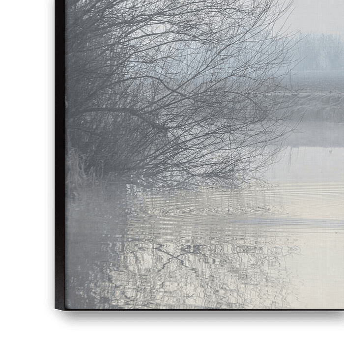 Landscape, photo, horizontal of 3 willow trees in March at the pond. Taken very early in the morning. There is still some haze to be seen on the water.