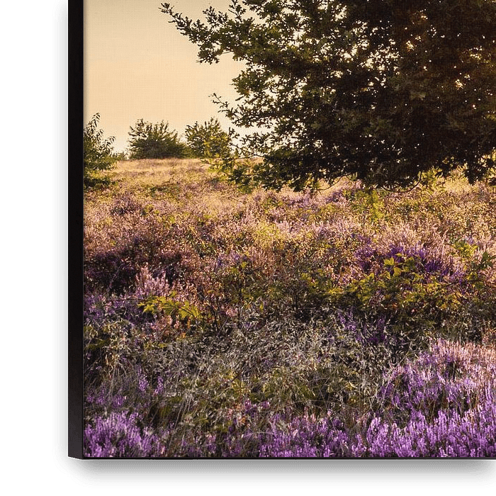 Buy this landscape artwork Landscape blooming heather at sunset by Hilda Weges on canvas, ArtFrame, poster and wallpaper, printed on demand in high quality.