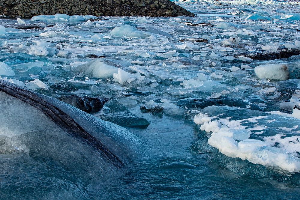 A spur from the Vatnajökull glacier enters the glacial lake of Jökulsárlón where the broken off icebergs drift away to the sea. There they are washed up by wind and tide on the black sands of Diamond Beach.