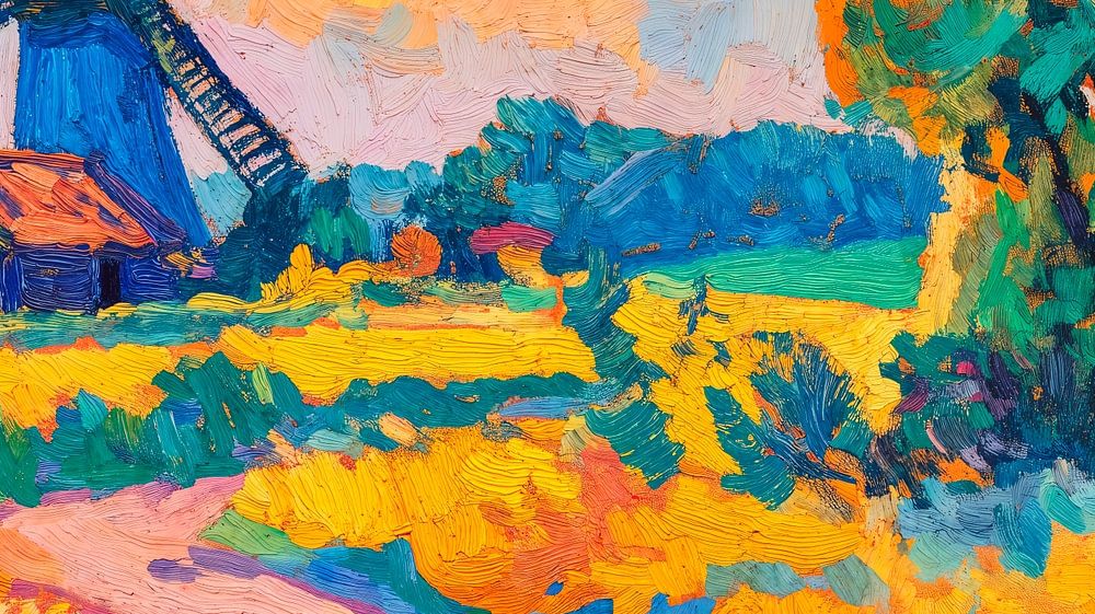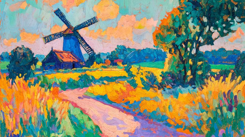 A vibrant Impressionist painting of a Dutch landscape featuring a windmill surrounded by lush, colourful foliage. A winding sandy path draws the viewer’s eye towards the windmill. The overall impression is that of a sunny, picturesque landscape in the style of Van Gogh.