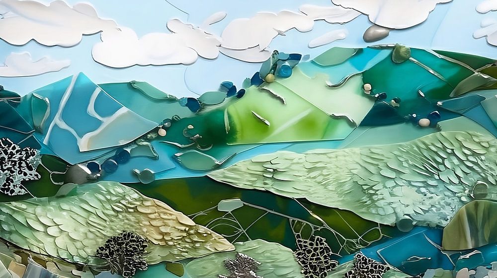 Buy this landscape artwork Landscape of shards of glass, porcelain, pottery and acrylic paint by Jan Bechtum on canvas, ArtFrame, poster and wallpaper, printed on demand in high quality.
