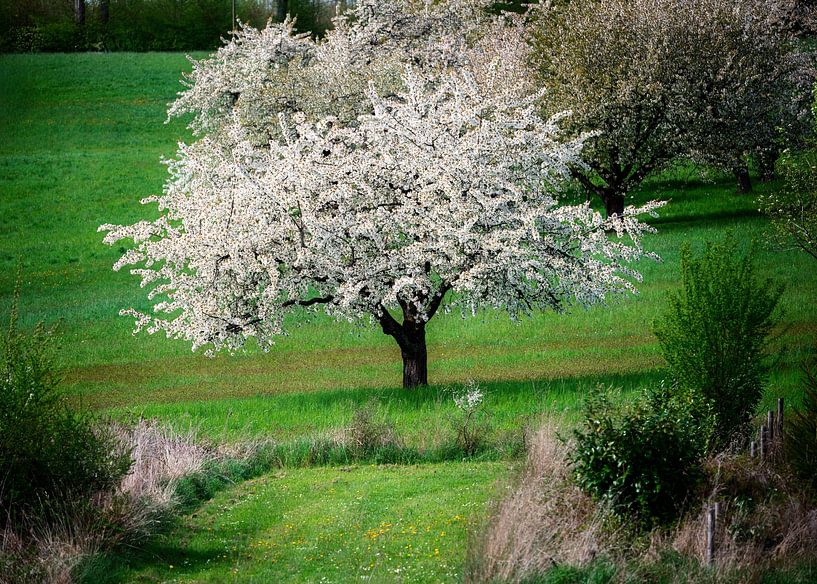 Buy the photo Landscape with a blossoming cherry tree by ManfredFotos on canvas, ArtFrame, poster and wallpaper, printed on demand in high quality.