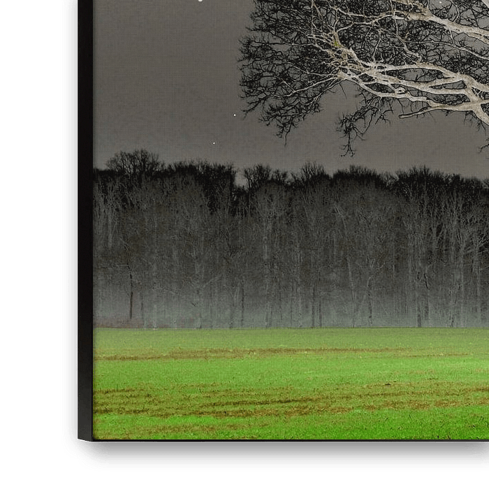 A night landscape with 3 oak trees, actually 4, back to back. On the horizon, a forest edge. The single trees stand in a green meadow. The full Moon shines over the dark scene. This is a photo edit. I like to create a different image from a captured photo. In this case, it is a scene that takes place at night while we are snug under the wool. It would fit well in a bedroom. I got the few stars visible in the sky from a photo of the night sky when it was cloudless.