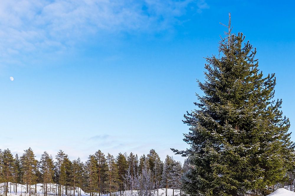 Landscape with snow and trees in winter in Kuusamo, Finland.
