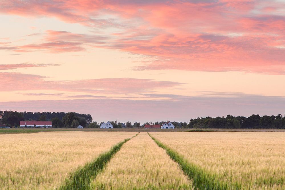 Landscape with wheatfield at sunset. The photo was taken in Groede, Zeeuws-Vlaanderen, Zeeland, the Netherlands. In the field a track up to the horizon creating a lot of depth in the image. The clouds are beautifully lit by the last rays of the sun.