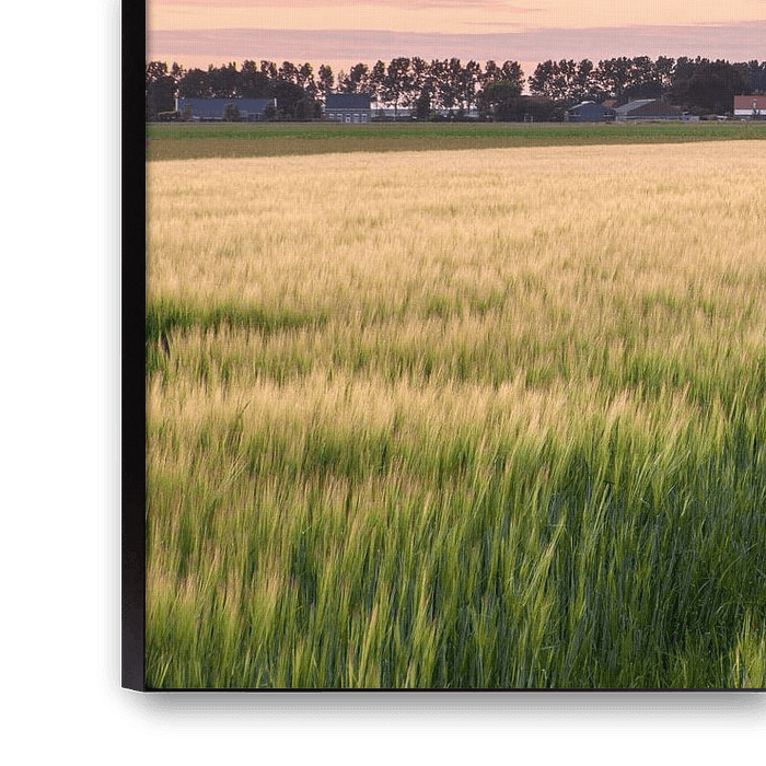 Landscape with wheatfield at sunset. The photo was taken in Groede, Zeeuws-Vlaanderen, Zeeland, the Netherlands. In the field a track up to the horizon creating a lot of depth in the image. The clouds are beautifully lit by the last rays of the sun.