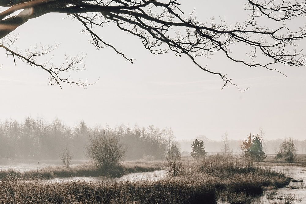 Serene landscape is natural tones. Calming to look at. Sunlight through the trees