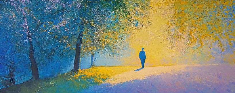 Landschap - In het midden-rechts van het doek trekt een eenzame silhouet de blik als een magneet naar zich toe: klein, rechtopstaand, stap voor stap richting een intens, warm licht. Het is een figuur in blauw, bijna als een schaduw die zichzelf tegemoet loopt. Rondom die persoon verandert het landschap van koel naar warm; links diepblauwe bomen en schaduwen, rechts een explosie van goudgeel en citroen — alsof de ochtend de lucht en grond tegelijk heeft aangeraakt. Dit is een figuur schilderij waarin licht en mens de hoofdrollen spelen, niet in verrassing maar in stille ontmoeting.