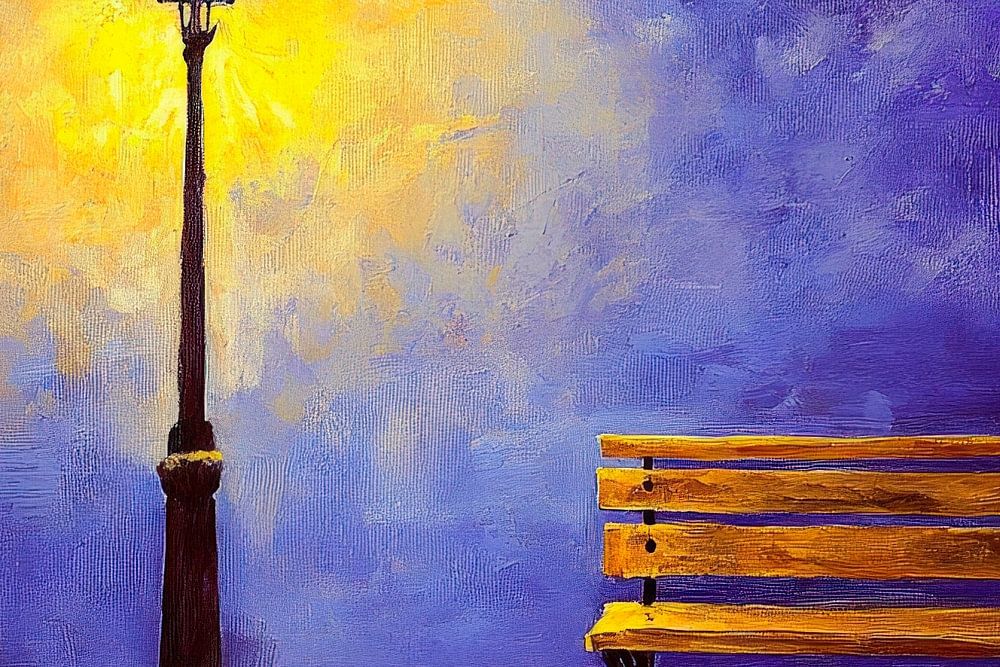 A soft light radiates from a nostalgic lantern and bathes a lonely park bench in a warm, golden glow. The deep blue backdrop lends the picture a dreamlike atmosphere, perfect for the bedroom. Here, every night is transformed into a moment of peace and reflection that invites you to dream.