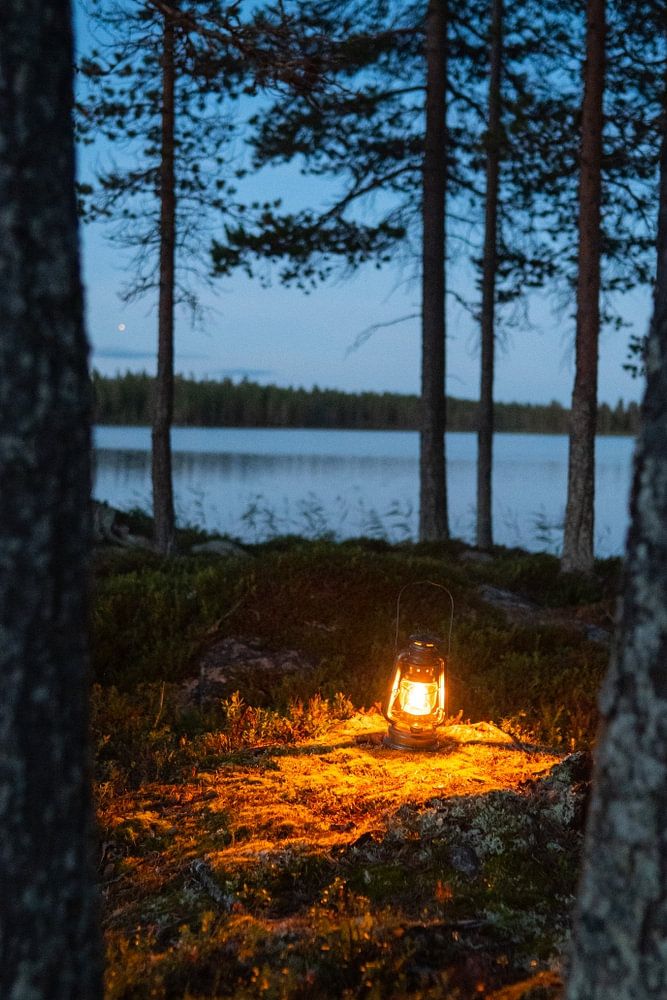 Back to basics in the forests of Norway. During a 4-day canoe trip through the Norwegian lakes, this was my light source. You can also use a torch or LED bulb, but it's not nearly as cosy and warm as this Feurhand Storm Lantern. They have been making it since WWII! Really a piece of quality and history. Wonderful how the lantern's warm light contrasts with the blue sky and water.