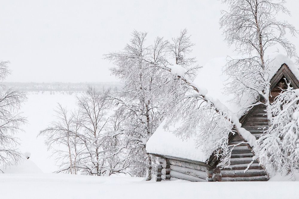 Lapland in Finland. A landscape in winter with snow and views of Lake Urtti. Landscape photography above the Arctic Circle. It can be very cold there, but this time it was not so bad, only -20 degrees. In the foreground two wooden huts, in the background the frozen lake can be seen between the trees.