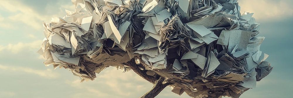 In this powerful panorama, you see an impressive tree constructed from folded sheets of paper. The background is a bright blue sky with clouds, making it bright and inviting. Combining creative design with natural composition, this wall decoration stands out for its playful texture. The wide format means you experience the tree in its full size, making it really come alive on your wall. This panorama fits perfectly in a modern interior and is a distinctly artistic addition to your space.