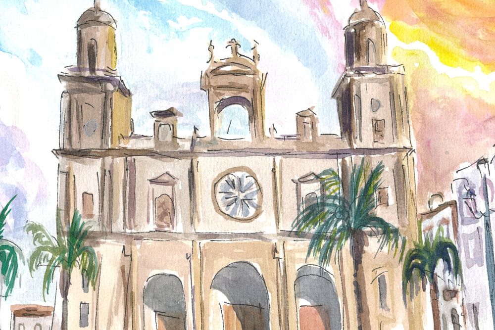 Las Palmas de Gran Canaria cathedral scene with sunset and plaza