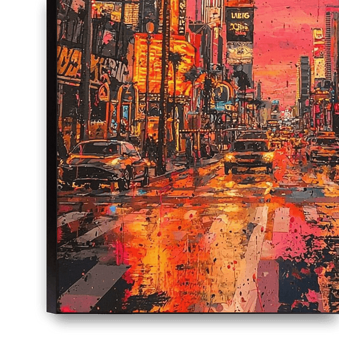 The image of the Las Vegas Strip bursts with energy in bright colours and abstract expressionist style. Neon pink, electric blue, orange and bright yellow race across the canvas in wild brushstrokes and explosive shapes. Skyscrapers and casinos are mere suggestions in the colourful chaos evoked by the city's nightlife. Everything pulses…