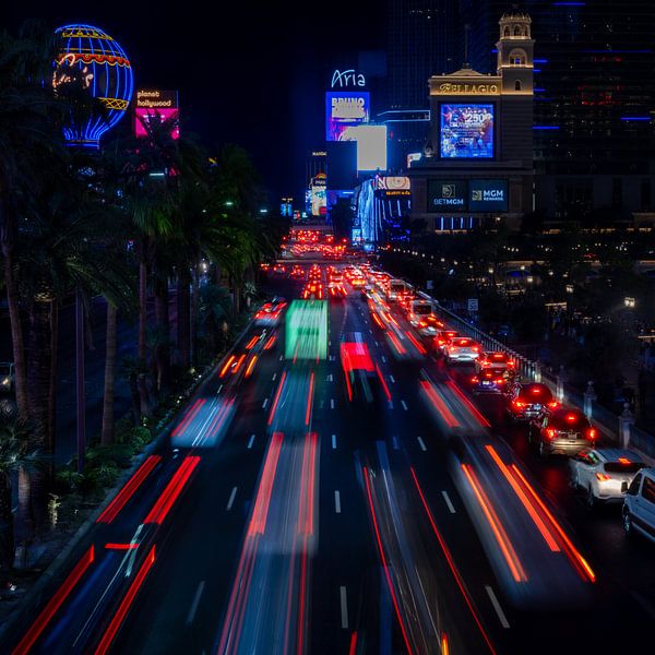 The Las Vegas Strip at night, captured with a long exposure. The streaks of light from the traffic lead to the iconic skyline of Aria and Bellagio – a dynamic image full of energy and colour.