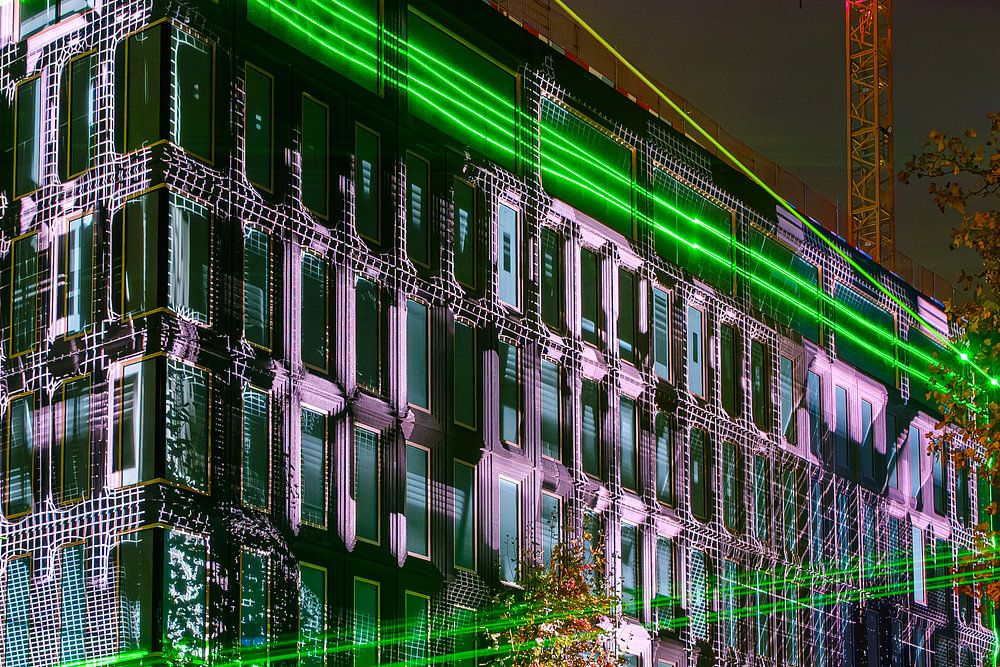 Office building Edge in the centre of Eindhoven during light festival GLOW 2025. Green laser beams mark the edges of the appropriately named building.