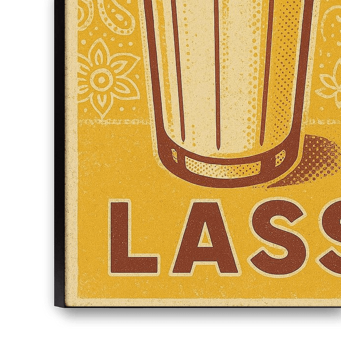 This refreshing Lassi artwork captures the soothing essence of India’s favorite yogurt drink — a perfect counterpoint to the country’s bold spices. Bathed in saffron yellow and cream tones, the design glows with calm energy and balance. Paisley swirls and lotus flowers weave through the background, symbolizing serenity and renewal, while the vintage print texture recalls the posters that once brightened Indian teahouses and railway cafés. The tall glass of frothy lassi stands at the center like a symbol of hospitality, sweetness, and cool relief on a hot afternoon. With its minimalist yet expressive aesthetic, this piece blends cultural nostalgia with modern design — ideal for kitchens, cafés, or anyone drawn to the gentle poetry of Indian everyday life.