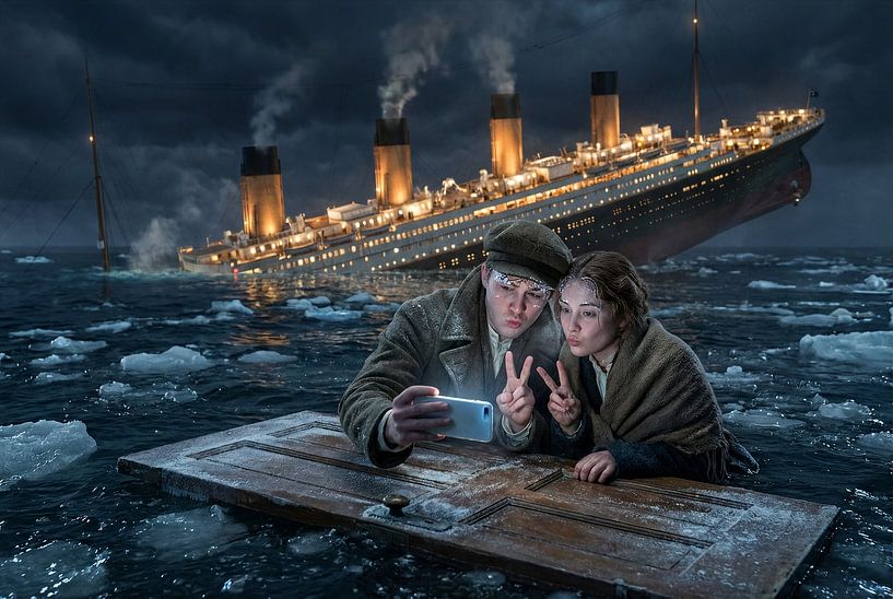 This work is relentlessly topical, precisely because it masquerades as history. Two young people float on an improvised raft in ice-cold water. Behind them, an icon of human hubris sinks. The ship is listing, the lights are still on, the night is relentless. And yet: they do not laugh, they do not cry — they pose. Peace signs. Camera…
