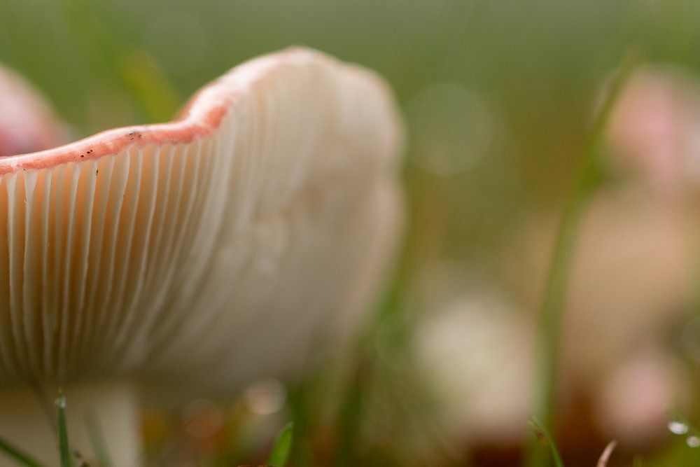 Older fly agarics in the grass. Most of them have already fallen over. Only one is still standing proudly.