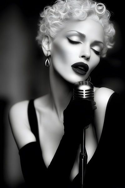 A singer with short, light blonde, curly hair stands close to a classic retro microphone. The photograph is in high-contrast black and white. She wears a low-cut black dress and long gloves; a single drop earring accentuates her profile. Her eyes are closed, her lips slightly parted, as if she is in the intense moment of singing a…