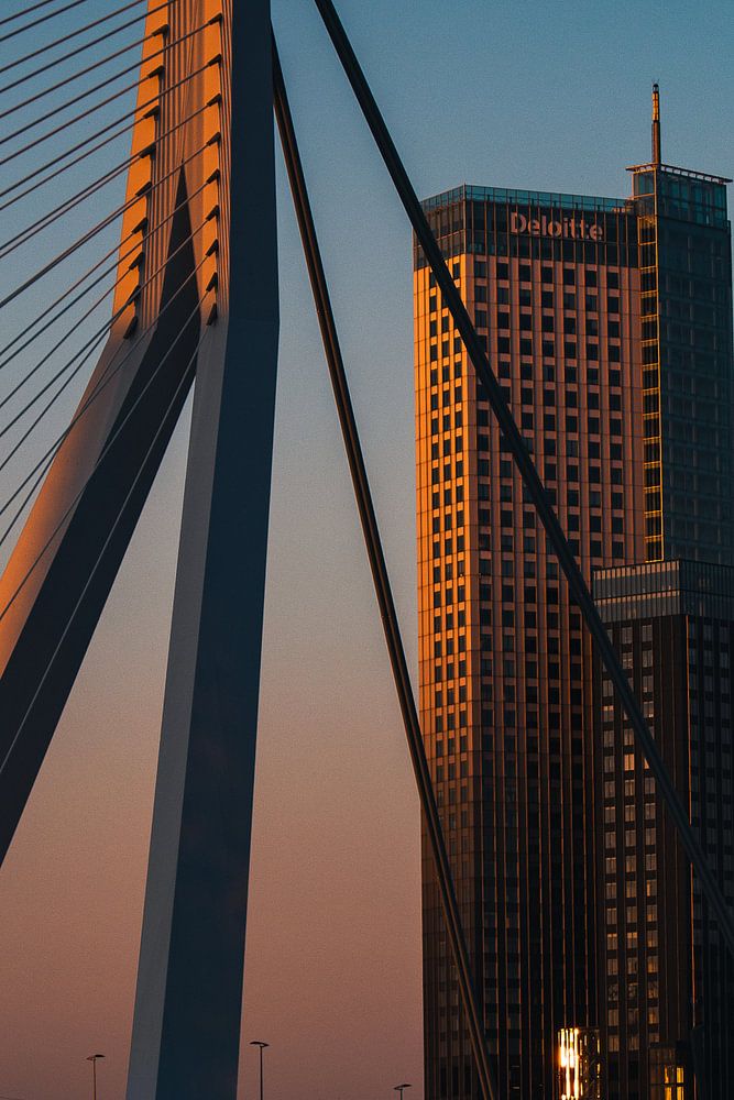 The Erasmus bridge, the icon of Rotterdam, during sunset on a beautiful summer evening. The sunrays give a nice orange glow on the bridge and the buildings behind. The orange glow contrasts nicely with the blue sky of the blue hour.
