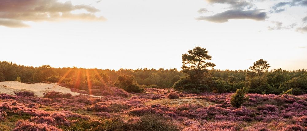 The setting sun colours the flowering heather in golden light. Photo taken in the nature reserve Drouwenerzand in Drenthe.