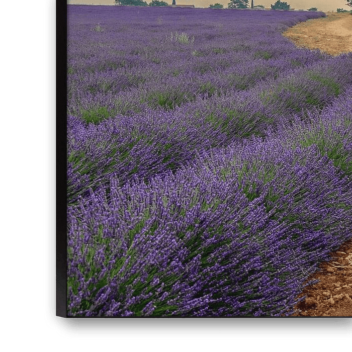 Lavender flowers blossoming on the plateau of Valensole in the Provence during sunrise at the start of a warm summer day. It typically occurs from late June to mid-July, depending on the weather and elevation. The air is filled with sounds of buzzing bees and the scent of lavender permeates the air. Golden wheat fields grow nearby, adding colorful contrast. Local products include lavender oil, soaps, liqueurs, and honey.