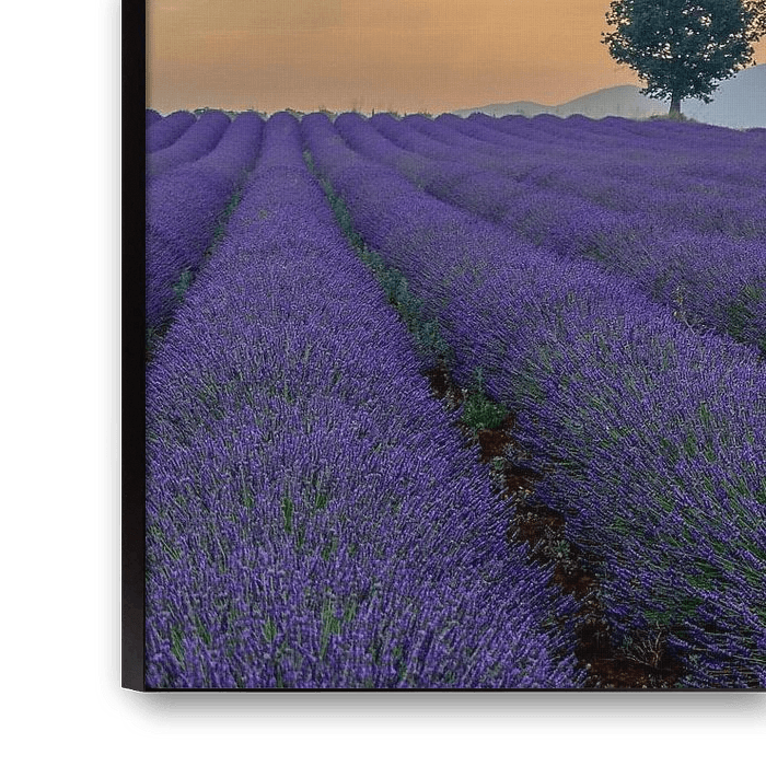 Lavender flowers blossoming on the plateau of Valensole in the Provence during sunrise at the start of a warm summer day. It typically occurs from late June to mid-July, depending on the weather and elevation. The air is filled with sounds of buzzing bees and the scent of lavender permeates the air. Golden wheat fields grow nearby, adding colorful contrast. Local products include lavender oil, soaps, liqueurs, and honey.
