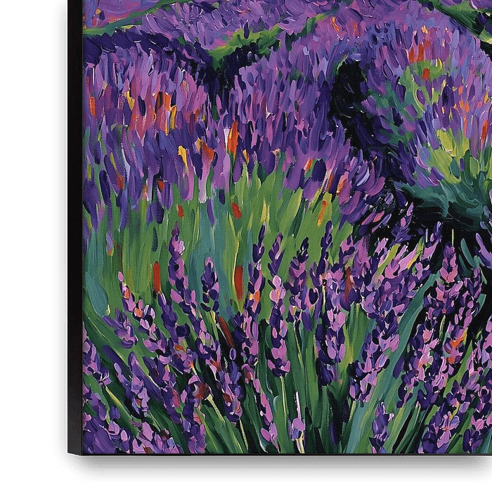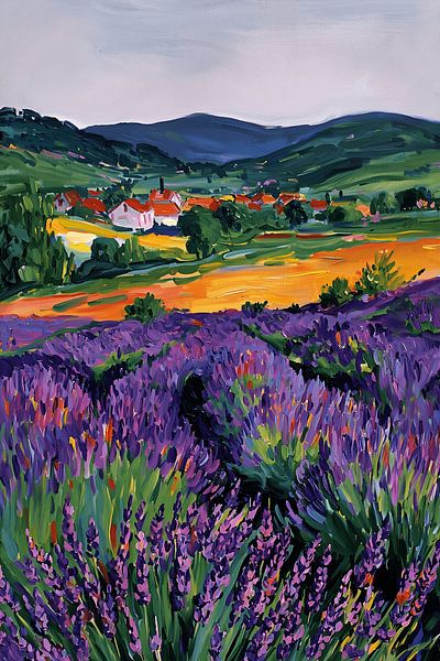 This colourful artwork depicts expansive lavender fields stretching in gentle rows across a hilly landscape. In the background lies a small village nestled among green hills under a tranquil sky. The lively, impressionistic painting style and intense shades of purple and green convey the summer warmth, fragrance and relaxed atmosphere…