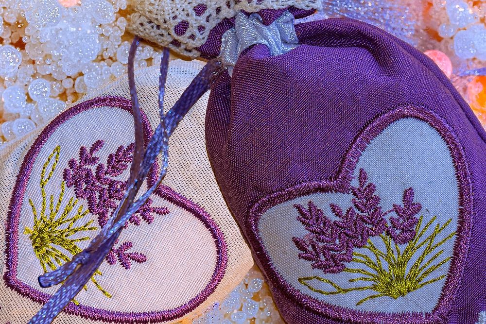 Two small fabric pouches from Croatia lie nestled decoratively in a sea of light, glittering pearls and soft reflections of light. The pouch on the left is in a light beige, whilst the one on the right shines in a rich violet; both are adorned with heart-shaped lavender embroidery. Delicate lace trims along the top edge and dainty…