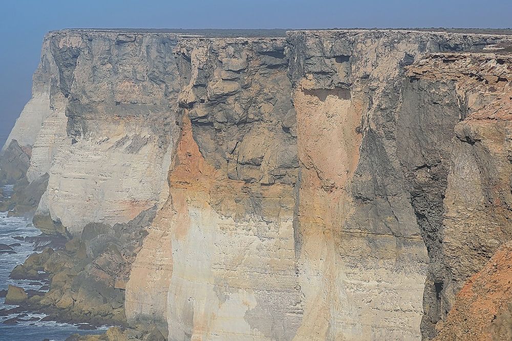Layered cliff details at Scenic Lookout #2 along the Eyre Highway on the Nullarbor in South Australia. The slight morning mist gave this view a really great atmosphere. Apart from a few campers there was no-one around this early in the morning.
