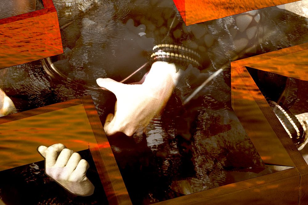Photography, graphic drawing and collage in sepia, yellow and black.