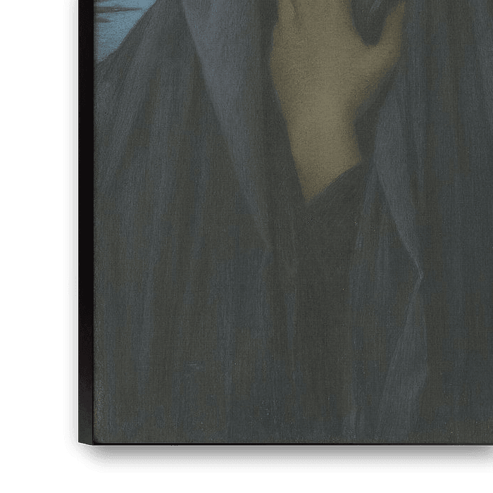 Le Silence, a picture that Levy-Dhurmer kept throughout his life, is without doubt one of his most fascinating works. It has the suggestive power of an icon, an image that is all the more compelling for being presented as an enigma: fixed in a hieratic pose, with eyes hidden in shadow, the figure eludes all explanation. Solid and immobile, it keeps what we imagine to be the secret of its mourning to itself. The long, falling folds, enhanced by the vertical format, cannot but evoke both physical gravity (from which it is impossible to escape) and moral gravity.