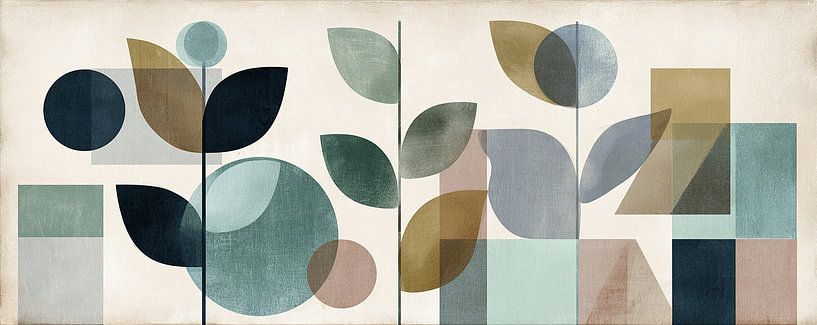 Leaves Composition | Leaf Shapes - This abstract painting depicts a modern composition of leaves and geometric shapes in various shades of green and brown, with a light-coloured background that accentuates the natural elements.