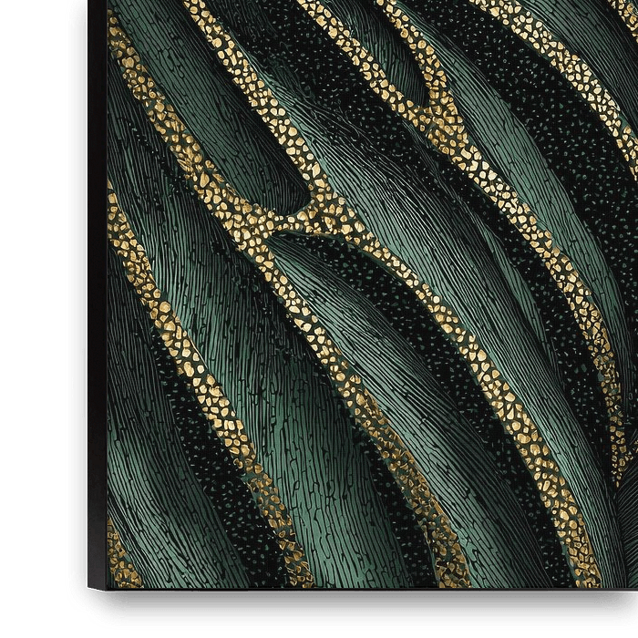 This refined work of art presents an abstract interpretation of a leaf, in which deep emerald green tones blend harmoniously with shimmering gold accents. The organic lines and veins create an elegant rhythm that feels both natural and luxurious. The texture is reminiscent of hand-drawn illustrations, while the golden details give the…