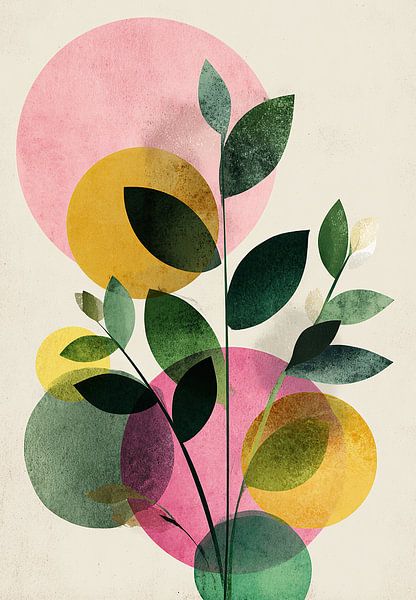 Details: leaves, circles, green, yellow, pink, botanical, modern, interior, art, colourful