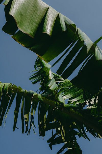 You see a group of large, bright green leaves growing close together. The light falls on them partially, making some parts bright and others darker. In the background, there is more tropical greenery. It feels as if you are standing very close, right in the middle of the plants.