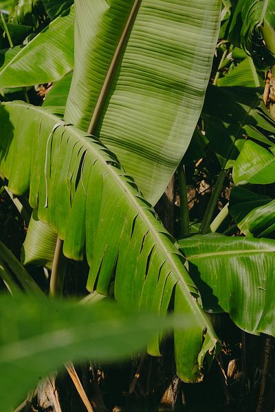 You see a group of large, bright green leaves growing close together. The light falls on them partially, making some parts bright and others darker. In the background, there is more tropical greenery. It feels as if you are standing very close, right in the middle of the plants.