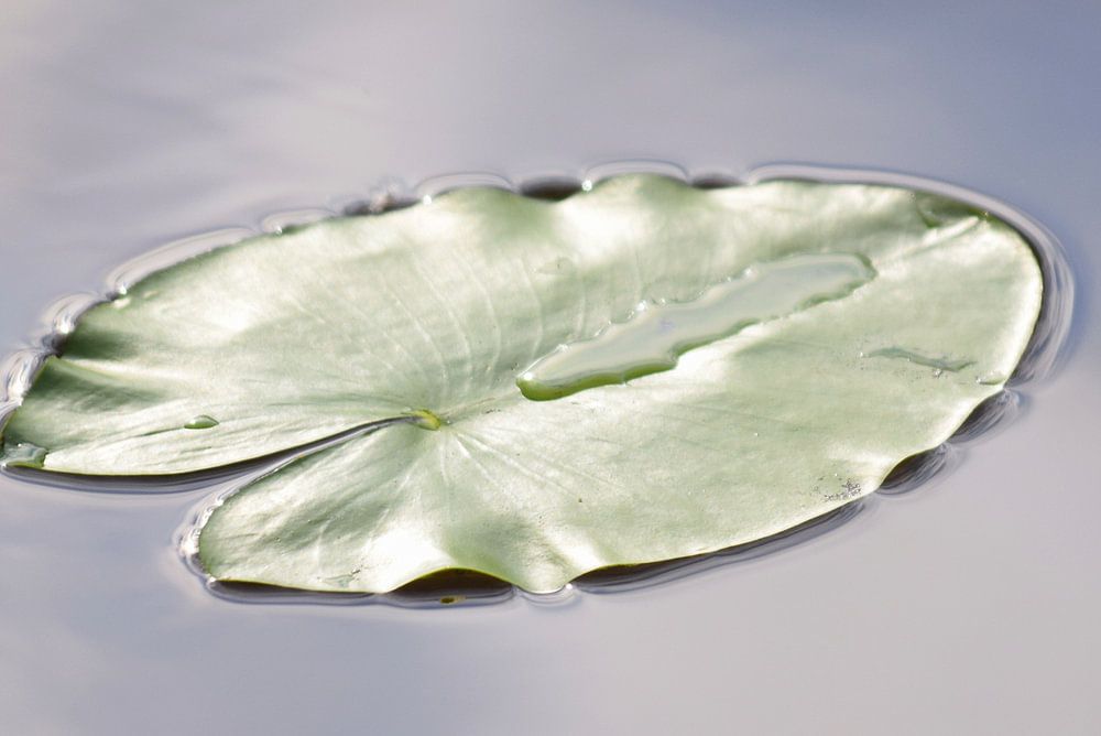 A leaf floats on a quiet water surface, with the clouds reflected in the water.