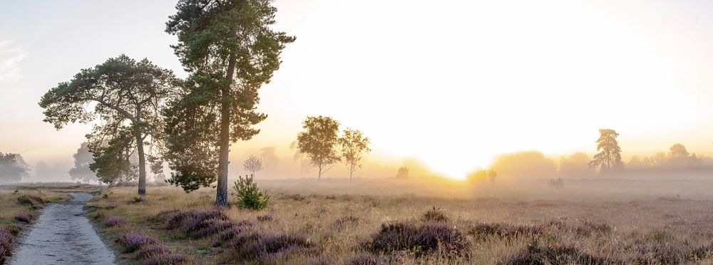 Landscape panorama on the Leersumse veld in Leersum, Utrecht province, with view over the misty heath with a footpath, some trees and the rising sun.
