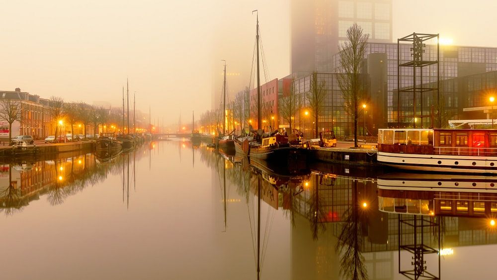 Skyline Avero-Achmea centre Leeuwarden. Wide view at the quay near the fox park in Leeuwarden. Warm colors on a quiet foggy morning.