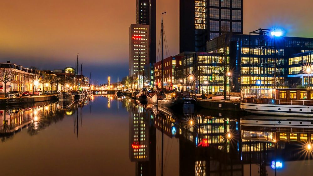 Skyline Avero-Achmea centre Leeuwarden. Wide view at the quay near the fox park in Leeuwarden. Warm colors on a quiet evening.